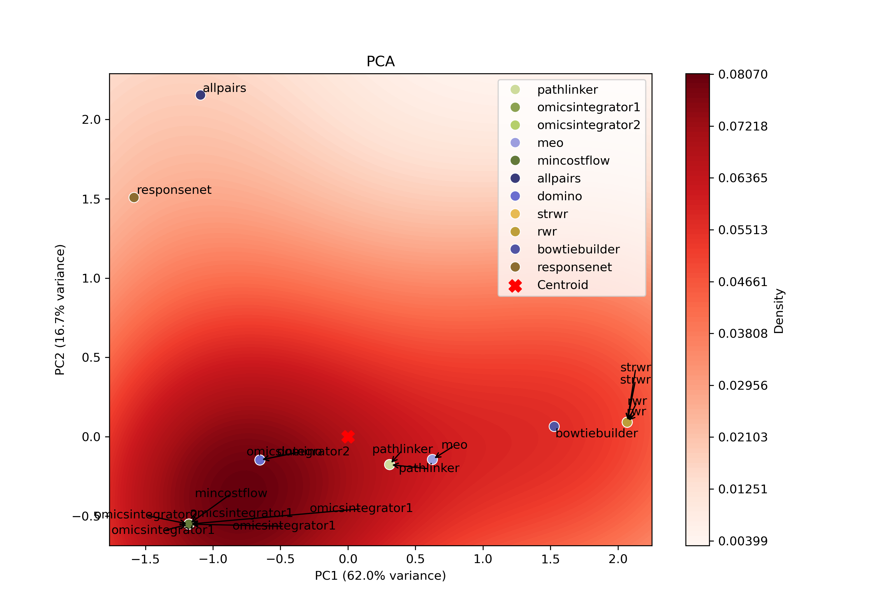 Within each PCA space, a kernel density estimate (KDE) is computed over the projected points to identify regions of high density. The output closest to the highest KDE peak is selected as the most representative parameter setting, as it corresponds to the region where the algorithm most consistently produces similar subnetworks.