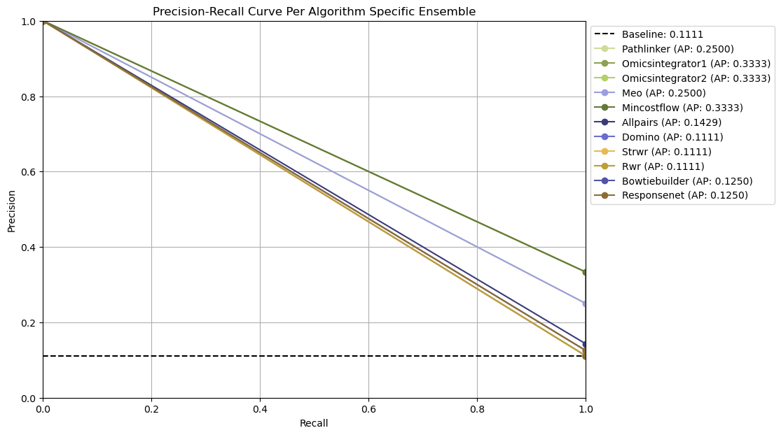 When evaluation is enabled, SPRAS will automatically run its built-in evaluation analysis on each defined dataset-gold standard pair. This evaluation computes metrics such as precision, recall, and precision-recall curves, depending on the parameter selection method used.